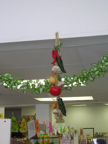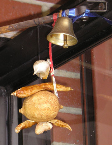 Lemons, Peppers and Garlic as Apotropaions in a Punjabi Grocery Store in West Philadelphia ![]() This amulet is much like others pictured in other files of the collection. The hanging of the lemon and peppers is done in the same manner as file ind002. The amulet is quite similar in composition to that in file ind003, having peppers, garlic, a lemon and a blue ribbon at the top. This one also contains red string and a bell. Blue and red are common apotropaic colors. The bell is also apotropaic (as well as practical), making the whole ensemble quite a complex apotropaion. Like the other amulet found in West Philly, file ind004, it is also dried up and slightly dust covered. ![]() ![]() In the store itself, over the vegetable boxes, a string of plastic vegetables hangs, including lemons, peppers and garlic. This reminds me of the many Italian plastic charms against the evil eye. If one did not know better, they might simply think that this string of plastic vegetables simply marked the vegetable section like a sign. ![]() ![]() |